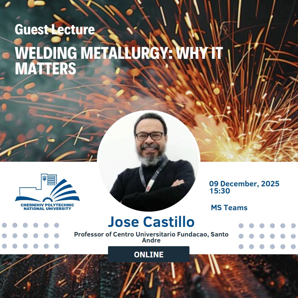 Гостьова лекція професора Джозе Кастільо 09 грудня 2025 року на кафедрі Технологій зварювання та будівництва Національного університету «Чернігівська політехніка» в онлайн форматі відбулася гостьова лекція професора університету Сан-Паулу, (Бразилія) Джозе Кастільо / Jose Castillo на тему: Welding Metallurgy: Why It Matters. Професор Кастільо має сорокарічний […]